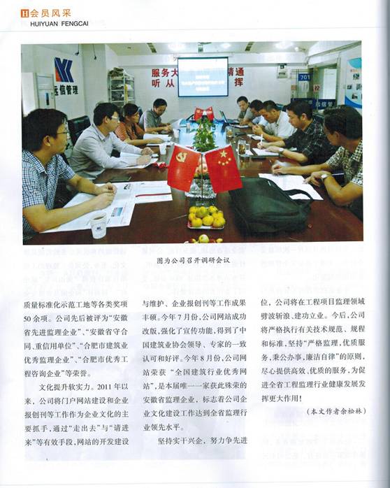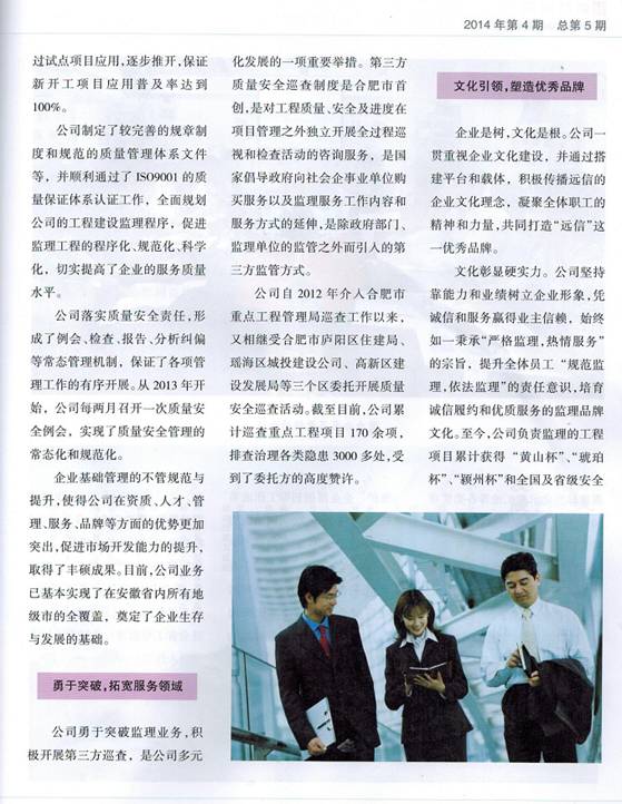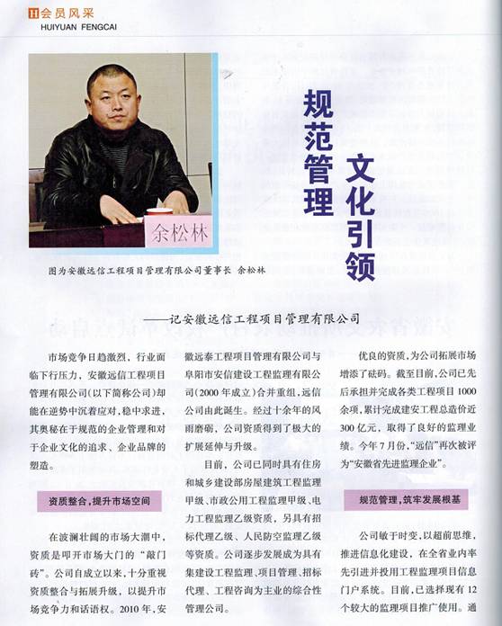 9月30日出版的《合肥招標(biāo)投標(biāo)雜志》(2014年第4期)重點(diǎn)刊發(fā)了公司董事長(zhǎng)余松林撰寫(xiě)的題為《規(guī)范管理 文化引領(lǐng)――安徽遠(yuǎn)信工程項(xiàng)目管理有限公司》的專題文章,全面展示了公司發(fā)展成果,體現(xiàn)了企業(yè)的良好風(fēng)貌,提升了企業(yè)形象和文化軟實(shí)力。文章分為資質(zhì)整合提升市場(chǎng)空間、規(guī)范管理筑牢發(fā)展根基、勇于突破拓寬服務(wù)領(lǐng)域、文化引領(lǐng)塑造優(yōu)秀品牌等四個(gè)篇章,全文如下: