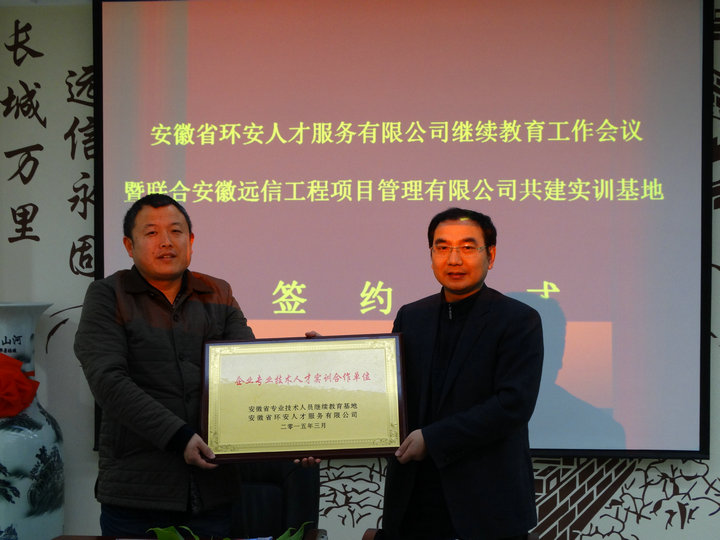 3月18日,安徽省環(huán)安人才服務(wù)有限公司繼續(xù)教育會(huì)議暨與安徽遠(yuǎn)信工程項(xiàng)目管理有限公司共建實(shí)訓(xùn)基地簽約儀式在公司會(huì)議室隆重召開(kāi)。省人社廳專(zhuān)業(yè)技術(shù)人員管理處處長(zhǎng)羅志年、副處長(zhǎng)司永純、調(diào)研員吳偉等領(lǐng)導(dǎo)蒞臨會(huì)議并作重要講話。省繼續(xù)教育協(xié)會(huì)副秘書(shū)長(zhǎng)、安徽環(huán)安人才服務(wù)有限公司總經(jīng)理葉松,公司董事長(zhǎng)余松林、總經(jīng)理朱敏、常務(wù)副總兼總工郝傳山等相關(guān)人員出席會(huì)議。會(huì)議由環(huán)安人才服務(wù)有限公司培訓(xùn)部(繼續(xù)教育基地辦公室)負(fù)責(zé)人毛奇主持。