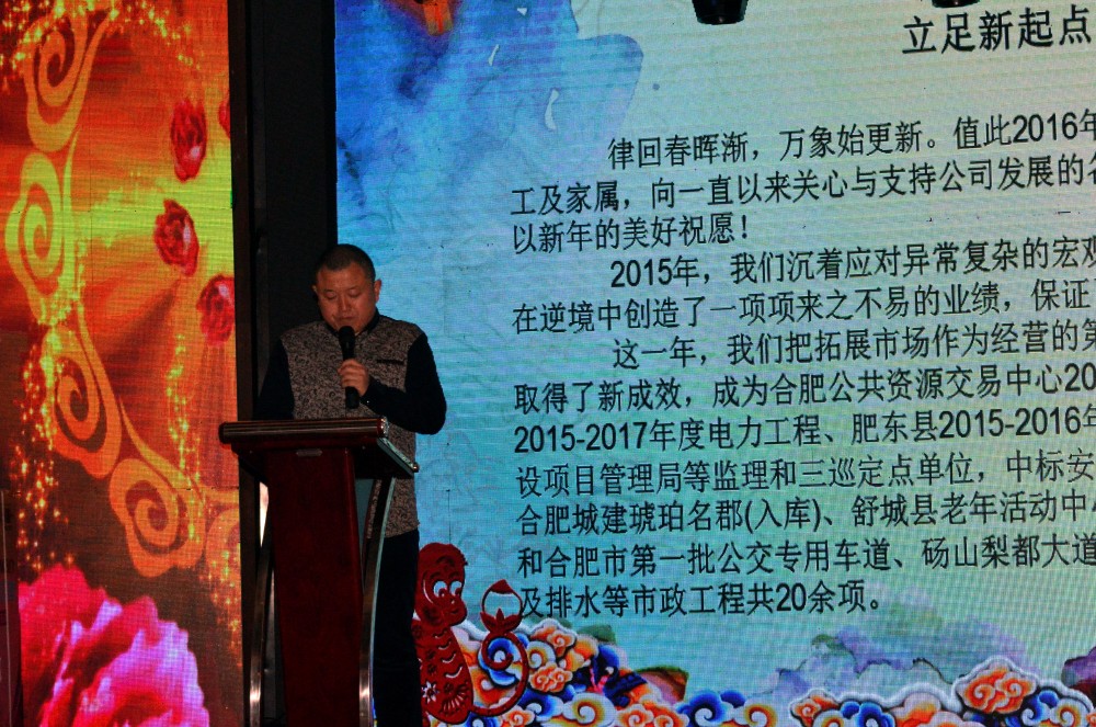 1月30日上午,公司“2016創(chuàng)新.贏天下”主題新年年會(huì)在合肥同慶樓舉辦。公司董事長余松林、總經(jīng)理朱敏、常務(wù)副總經(jīng)理兼總工程師郝傳山以及各巡查組、項(xiàng)目監(jiān)理部人員參加了年會(huì)。