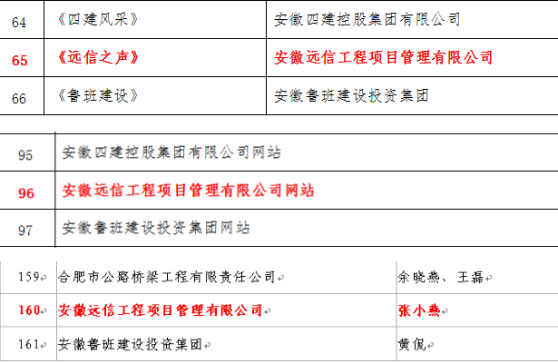 5月9日,中國建筑業(yè)協(xié)會公布了第六屆全國建筑行業(yè)信息傳媒工作競賽優(yōu)勝者名單,公司企業(yè)報《遠(yuǎn)信之聲》連續(xù)第二年被評為“全國建筑行業(yè)優(yōu)秀報紙”,公司網(wǎng)站連續(xù)第三年被評為“全國建筑行業(yè)優(yōu)秀網(wǎng)站”,公司報紙及網(wǎng)站編輯張小燕被評為“全國建筑行業(yè)信息宣傳優(yōu)秀工作者”。