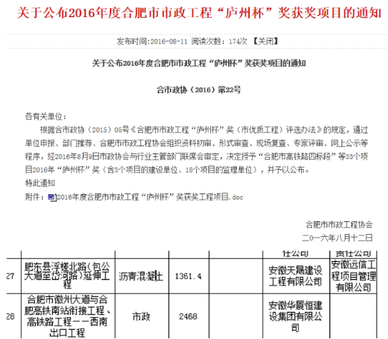 8月12日,合肥市城鄉(xiāng)建設(shè)委員會(huì)網(wǎng)站公布了2016年“廬州杯”獎(jiǎng)(市優(yōu)質(zhì)工程)的評(píng)獎(jiǎng)結(jié)果,公司監(jiān)理的肥東縣浮槎北路(包公大道至岱河路)延伸工程項(xiàng)目名列榜單。