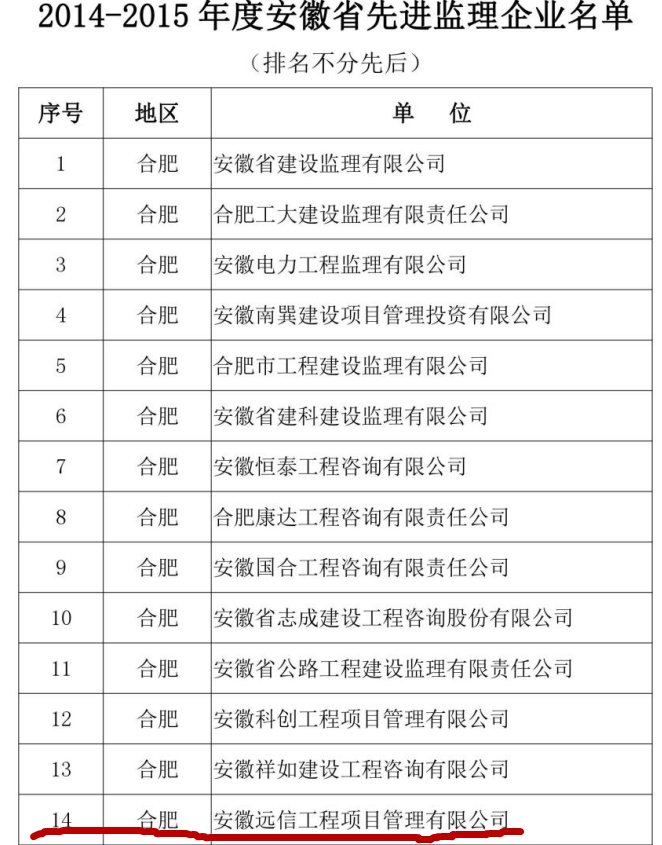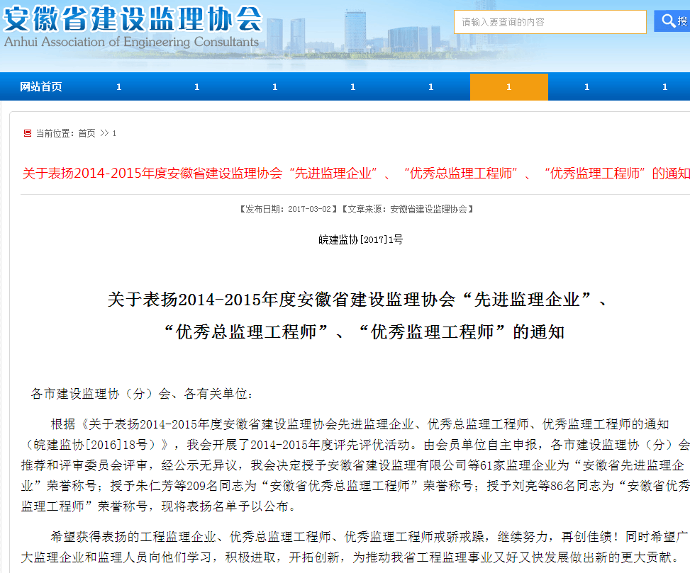 2017年3月2日,安徽省建設(shè)監(jiān)理協(xié)會(huì)官網(wǎng)發(fā)布了《關(guān)于表揚(yáng)2014-2015年度安徽省建設(shè)理協(xié)會(huì)“先進(jìn)監(jiān)理企業(yè)”、“優(yōu)秀總監(jiān)理工程師”、“優(yōu)秀監(jiān)理工程師”的通知》文件,公司被授予“安徽省先進(jìn)監(jiān)理企業(yè)”稱號(hào),同時(shí)三名總監(jiān)張勇、趙賢禮、翟榮春被授予“安徽省優(yōu)秀總監(jiān)理工程師”稱號(hào)。