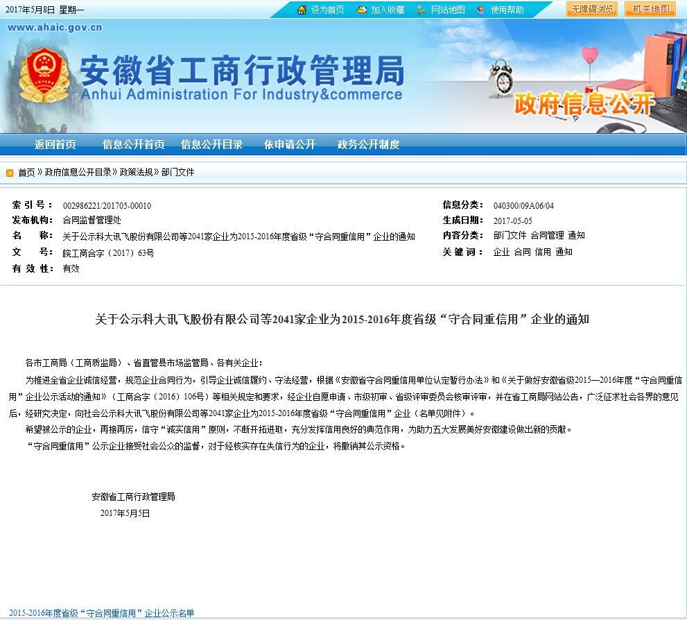 近日,安徽省工商行政管理局發(fā)布“2015-2016年度省級守合同重信用企業(yè)”公示評選結果,經企業(yè)自愿申請、市級初審、省級評審委員會核審評審,并在省工商局網站公告并廣泛征求社會各界的意見后,向社會公示2015-2016年度省級“守合同重信用”企業(yè),我公司再次獲得該項榮譽。