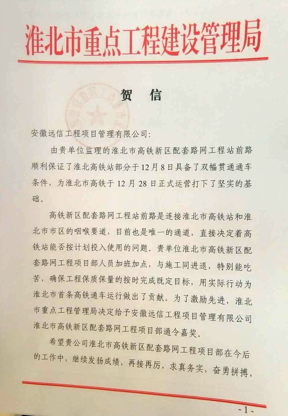 2017年12月18日,公司收到來自淮北市重點工程管理局的賀信,對我公司監(jiān)理的淮北市高鐵新區(qū)配套路網(wǎng)工程站前路項目監(jiān)理工作給予肯定及感謝。