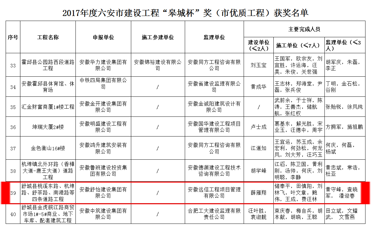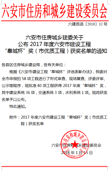 近日,六安市住房和城鄉(xiāng)建設(shè)委員會發(fā)文公布了2017年度六安市建設(shè)工程“皋城杯”獎(市優(yōu)質(zhì)工程)獲獎名單。由我司監(jiān)理的舒城縣桃溪東路、杭埠路、舒茶路、南港路等四條道路工程喜獲2017年度六安市建設(shè)工程“皋城杯”獎。