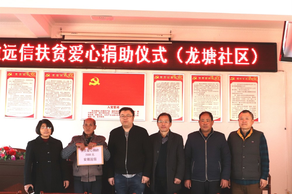 捐助儀式上,李道明主任對(duì)安徽遠(yuǎn)信此次的愛心捐助和對(duì)當(dāng)?shù)胤鲐毠ぷ鞯闹С纸o予了高度贊揚(yáng)。余松林董事長(zhǎng)在發(fā)言中簡(jiǎn)要介紹了公司的發(fā)展歷程和基本情況,隨后,他指出:扶貧攻堅(jiān)不僅是鎮(zhèn)政府黨委一項(xiàng)十分重要的工作任務(wù),也是企業(yè)應(yīng)當(dāng)承擔(dān)的社會(huì)責(zé)任。近年來,公司致力于將扶貧精神“內(nèi)化于心,外化于行”,已先后在省內(nèi)多個(gè)鄉(xiāng)鎮(zhèn)開展扶貧活動(dòng),盡可能的給予貧困力所能及的幫助。