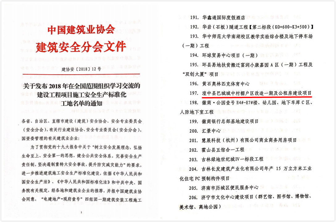 近日,從中國建筑業(yè)協(xié)會傳來捷報,由安徽遠信監(jiān)理的青海省湟中縣巴城城中村棚戶區(qū)改造一期及公租房建設項目被中國建筑業(yè)協(xié)會授予2018年“建設工程項目施工安全生產(chǎn)標準化建設工地”稱號,并列入全國組織學習交流的建設工程項目名單。