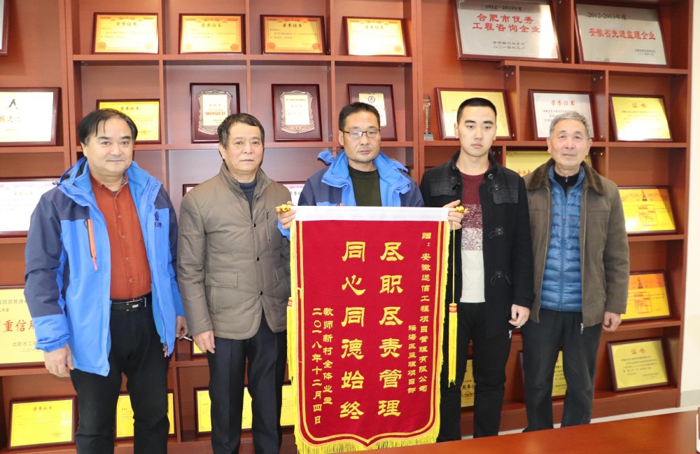 12月24日下午,教師新村的兩位業(yè)主代表、振凱園林公司代表專程來到安徽遠信,將一面寫有“盡職盡責管理,同心同德始終”的錦旗交于公司常務副總兼總工郝傳山的手中,再三感謝公司在教師新村環(huán)境綜合整治項目監(jiān)理工作中盡職盡責的專業(yè)表現。隨后,郝總與代表們進行了親切交談。