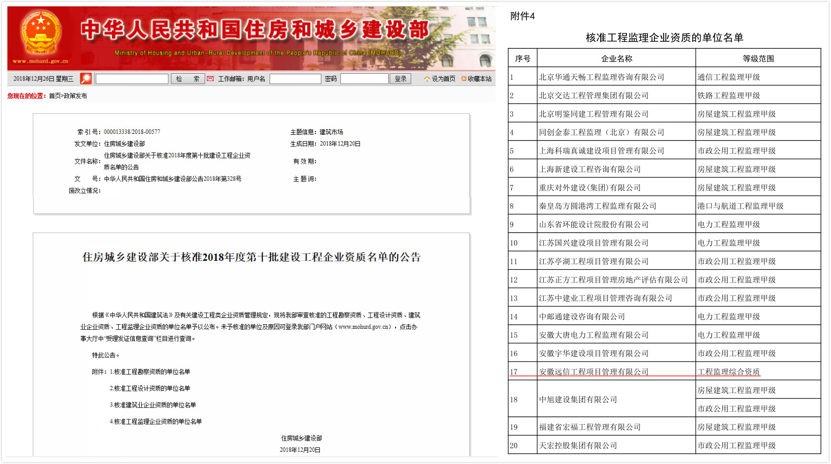 12月26日,根據(jù)住房城鄉(xiāng)建設(shè)部公告,公司喜獲工程監(jiān)理企業(yè)資質(zhì)最高級(jí)別--工程監(jiān)理綜合資質(zhì)。自此,安徽遠(yuǎn)信成為安徽省第8家、全國(guó)第188家可以承擔(dān)所有級(jí)別、所有專(zhuān)業(yè)工程類(lèi)別建設(shè)工程項(xiàng)目監(jiān)理業(yè)務(wù)的“全能型”企業(yè)。這是全體遠(yuǎn)信人孜孜不倦為之奮斗十余年而最終實(shí)現(xiàn)的戰(zhàn)略目標(biāo),在遠(yuǎn)信的發(fā)展進(jìn)程中具有里程碑意義。