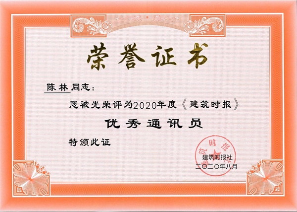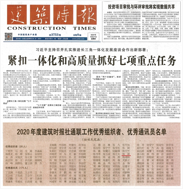 公司通聯(lián)部陳林獲評2020年度《建筑時報》全國優(yōu)秀通訊員稱號