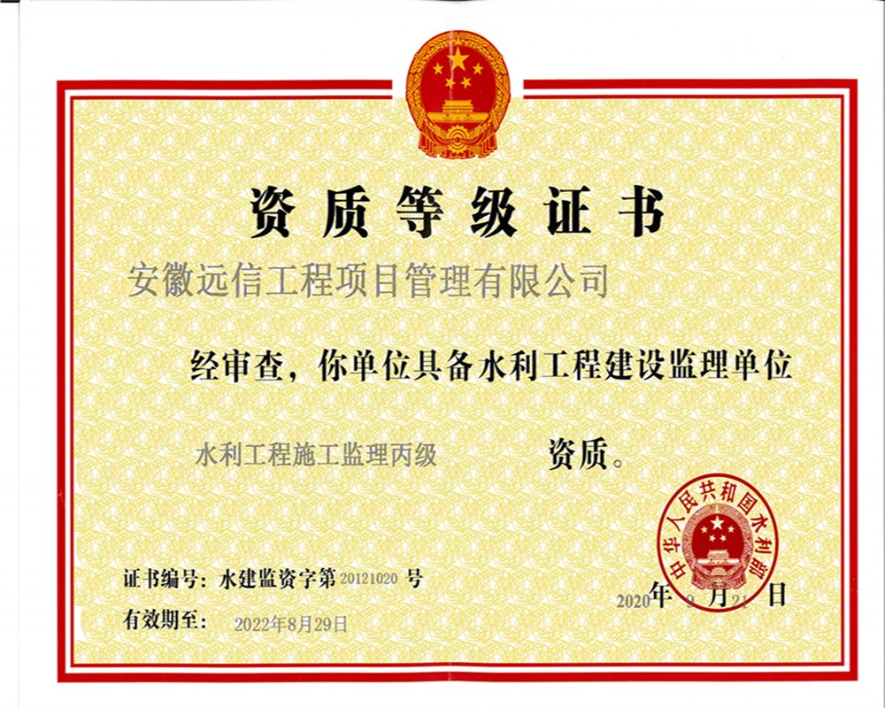 安徽遠(yuǎn)信成功取得水利工程施工監(jiān)理專業(yè)丙級資質(zhì)