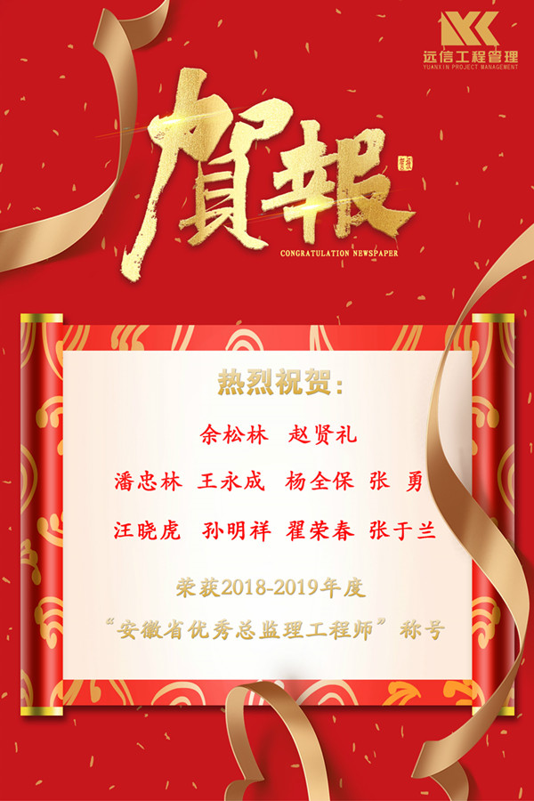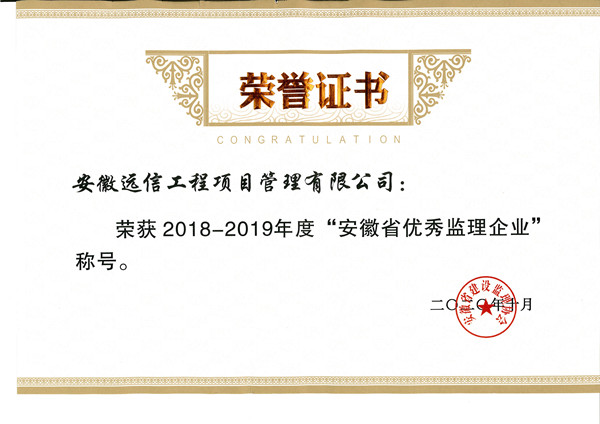 近日,從安徽省建設(shè)監(jiān)理協(xié)會傳來喜訊,安徽遠(yuǎn)信被授予2018-2019年度“安徽省優(yōu)秀監(jiān)理企業(yè)”榮譽稱號,這是繼2012年以來連續(xù)第4次獲得該項榮譽。同時,趙賢禮等10人榮獲“安徽省優(yōu)秀總監(jiān)理工程師”稱號。