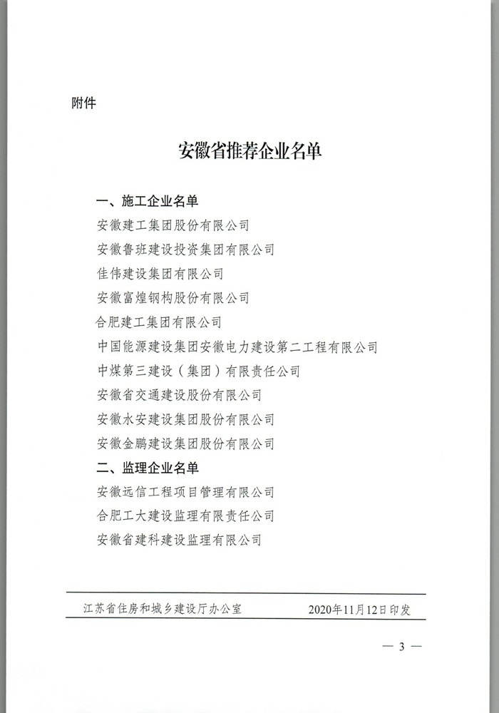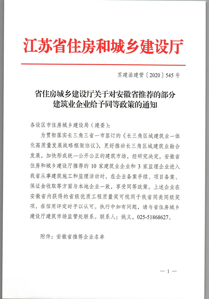 近日,江蘇省住房和城鄉(xiāng)建設(shè)廳發(fā)布《省住房城鄉(xiāng)建設(shè)廳關(guān)于對(duì)安徽省推薦的部分建筑業(yè)企業(yè)給予同等政策的通知》(蘇建函建管[2020]545號(hào)),準(zhǔn)予安徽遠(yuǎn)信在內(nèi)的3家監(jiān)理企業(yè)及10家建筑業(yè)企業(yè)在企業(yè)備案手續(xù)、項(xiàng)目備案、保證金收取等方面,享受與當(dāng)?shù)仄髽I(yè)同等政策。