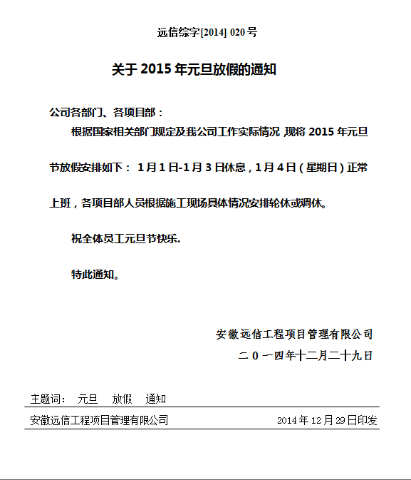 關(guān)于2015年元旦放假的通知 發(fā)布時間:2014-12-30 閱讀量:3339 上一篇:關(guān)于2015年清明節(jié)放假的通知下一篇:節(jié)約用紙 節(jié)約用電 綠色環(huán)保 一切從我做起