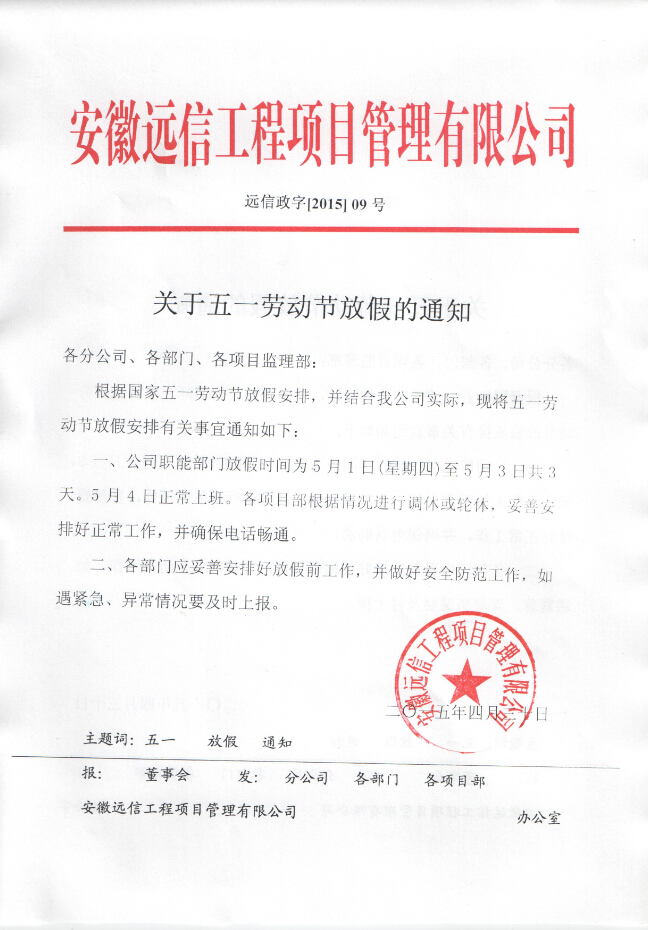 關(guān)于五一勞動(dòng)節(jié)放假通知 發(fā)布時(shí)間:2015-04-30 閱讀量:3562 上一篇:關(guān)于端午節(jié)放假通知下一篇:關(guān)于2015年清明節(jié)放假的通知