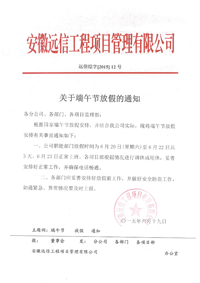 關(guān)于端午節(jié)放假通知 發(fā)布時(shí)間:2015-06-19 閱讀量:3366 上一篇:關(guān)于9月3號(hào)放假的通知下一篇:關(guān)于五一勞動(dòng)節(jié)放假通知