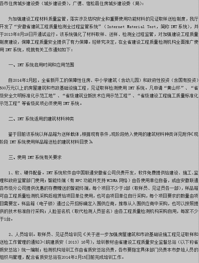 關(guān)于在全省建設(shè)工程質(zhì)量檢測機構(gòu)推廣使用安徽省建筑工程質(zhì)量檢測全過程監(jiān)管系統(tǒng)的通知 發(fā)布時間:2014-06-17 閱讀量:2182 上一篇:安徽省住房城鄉(xiāng)建設(shè)廳轉(zhuǎn)發(fā)住房城鄉(xiāng)建設(shè)部辦公廳關(guān)于組織開展全國建設(shè)工程質(zhì)量安全監(jiān)督執(zhí)法檢查的通知下一篇:關(guān)于進一步加強房屋建筑和市政基礎(chǔ)設(shè)施工程見證取樣和送檢工作管理的通知(轉(zhuǎn)發(fā))