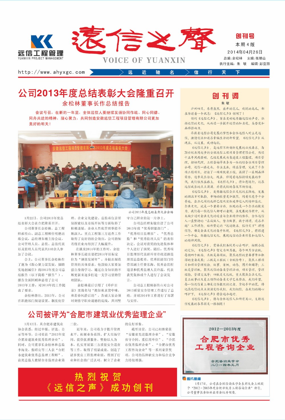企業(yè)報(bào)《遠(yuǎn)信之聲》(第一期) 發(fā)布時(shí)間:2014-09-09 閱讀量:2612 上一篇:企業(yè)報(bào)《遠(yuǎn)信之聲》(第二期)下一篇:企業(yè)報(bào)《遠(yuǎn)信之聲》成功創(chuàng)刊