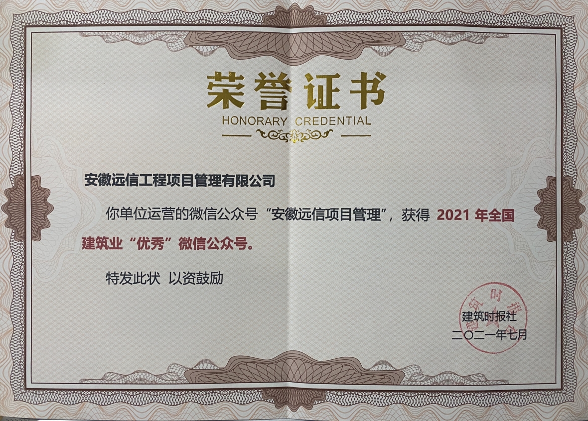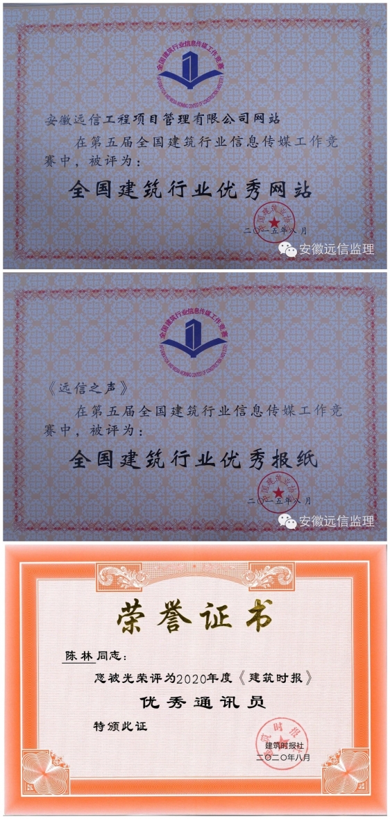 榮譽(yù)可喜可賀,是激勵(lì)也是動(dòng)力。 作為企業(yè)宣傳的重要載體,“安徽遠(yuǎn)信項(xiàng)目管理”公眾號(hào)自2015年創(chuàng)建以來(lái),立足公司運(yùn)營(yíng)發(fā)展,以服務(wù)企業(yè)核心工作,樹(shù)立公司良好形象為宗旨,與公司官網(wǎng)“遠(yuǎn)信工程”(www.cdymy.com.cn)、內(nèi)刊《遠(yuǎn)信之聲》有機(jī)結(jié)合,構(gòu)建了三大立體化企業(yè)文化傳播矩陣,得到了公司全體員工的高度認(rèn)可。同時(shí),這也是繼公司網(wǎng)站獲得中國(guó)建筑業(yè)協(xié)會(huì)《全國(guó)建筑行業(yè)優(yōu)秀網(wǎng)站》、公司報(bào)紙《遠(yuǎn)信之聲》獲得中國(guó)建筑業(yè)協(xié)會(huì)《全國(guó)建筑行業(yè)優(yōu)秀報(bào)紙》之后,企業(yè)文化宣傳領(lǐng)域增添的又一份全國(guó)性榮譽(yù)。公司負(fù)責(zé)網(wǎng)站、內(nèi)刊及微信公眾號(hào)運(yùn)維人員也多次獲得全國(guó)建筑行業(yè)信息宣傳優(yōu)秀工作者、優(yōu)秀通訊員稱(chēng)號(hào)。